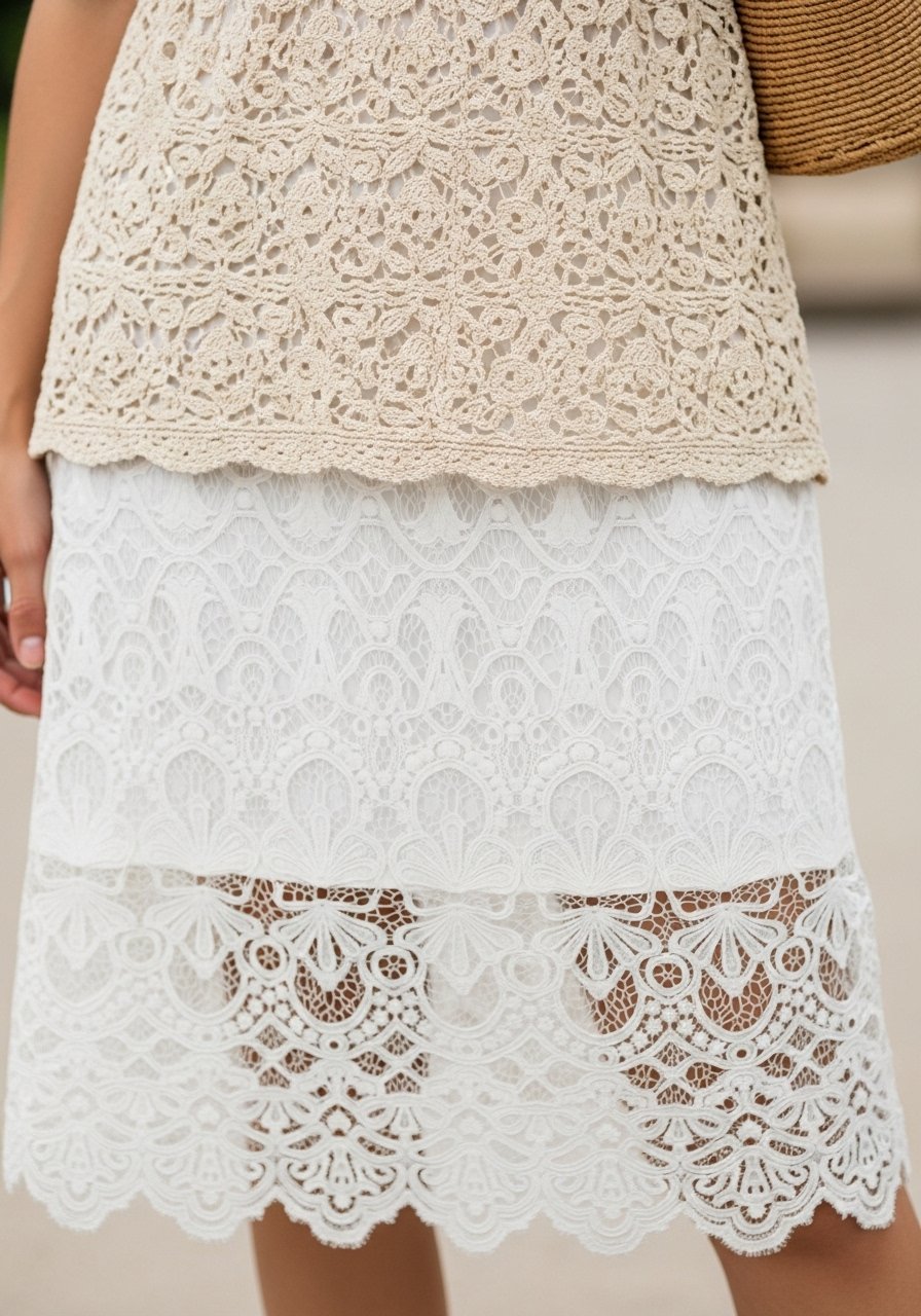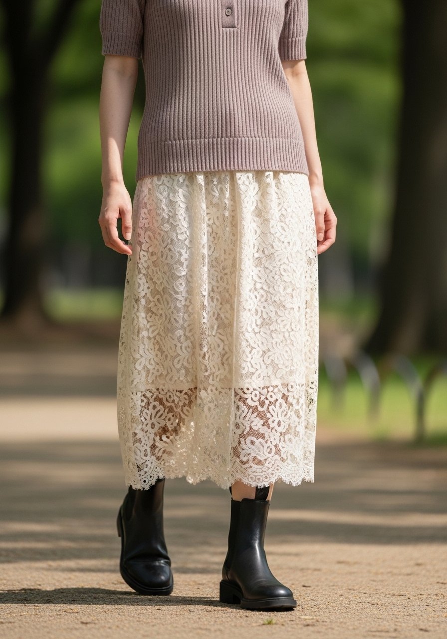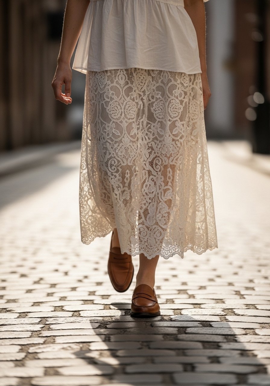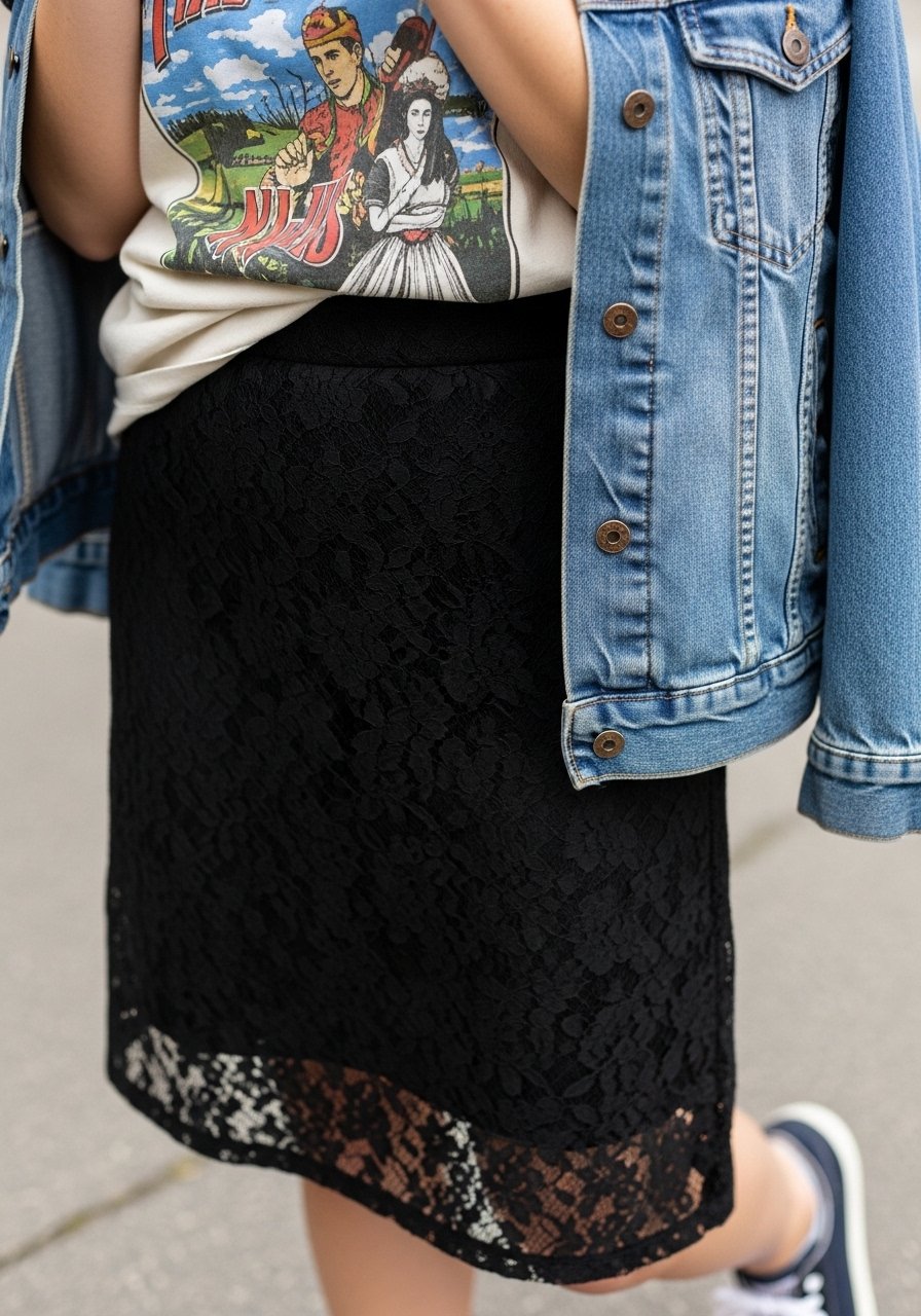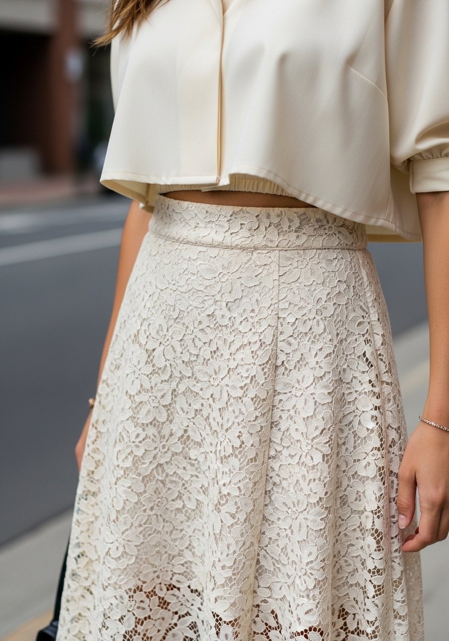 I wore this to run errands but still felt put together. The trick: match shades closely. It makes lace look modern, not frilly. I learned the hard way that a boxy tee ruins the silhouette—switch to a fitted tee.