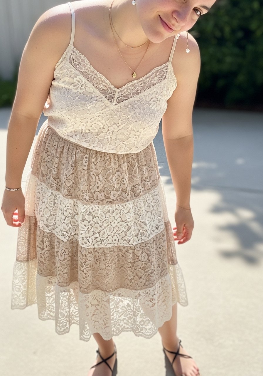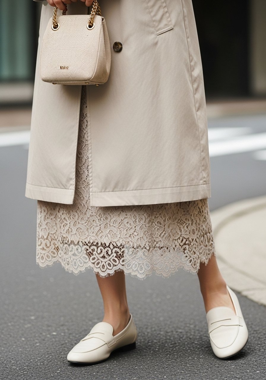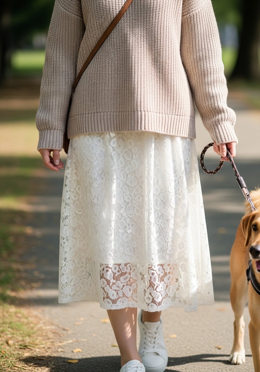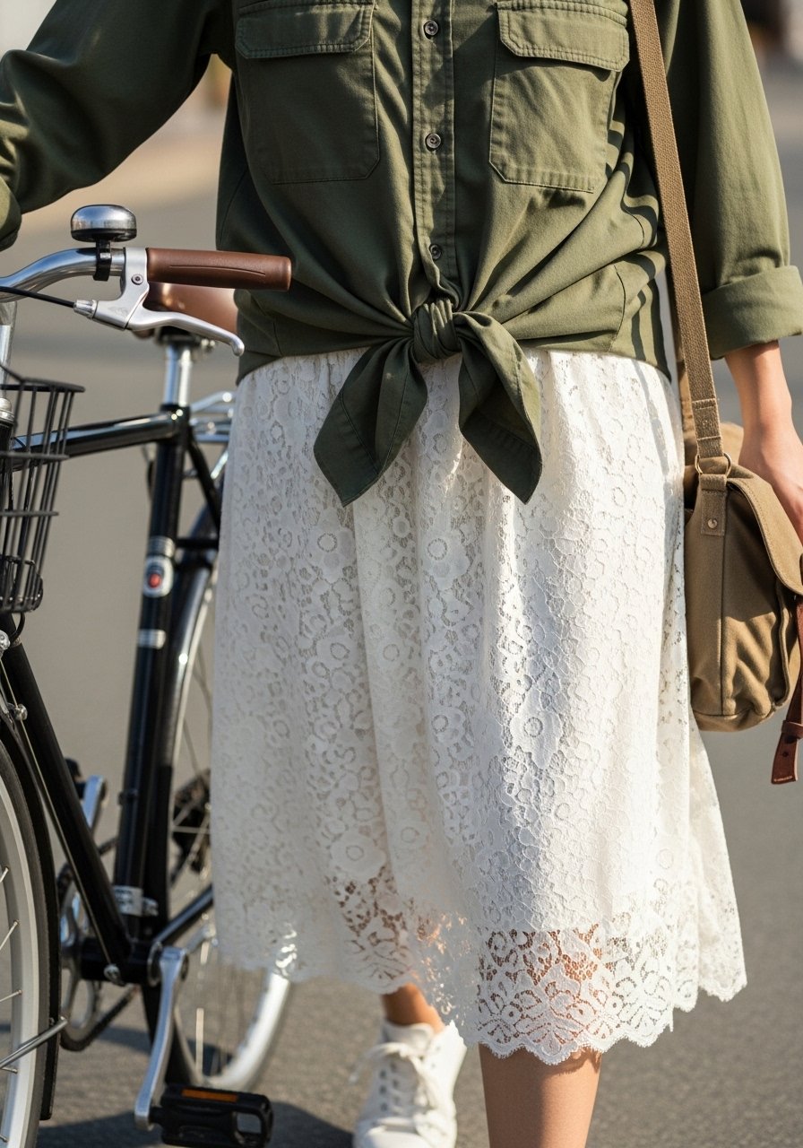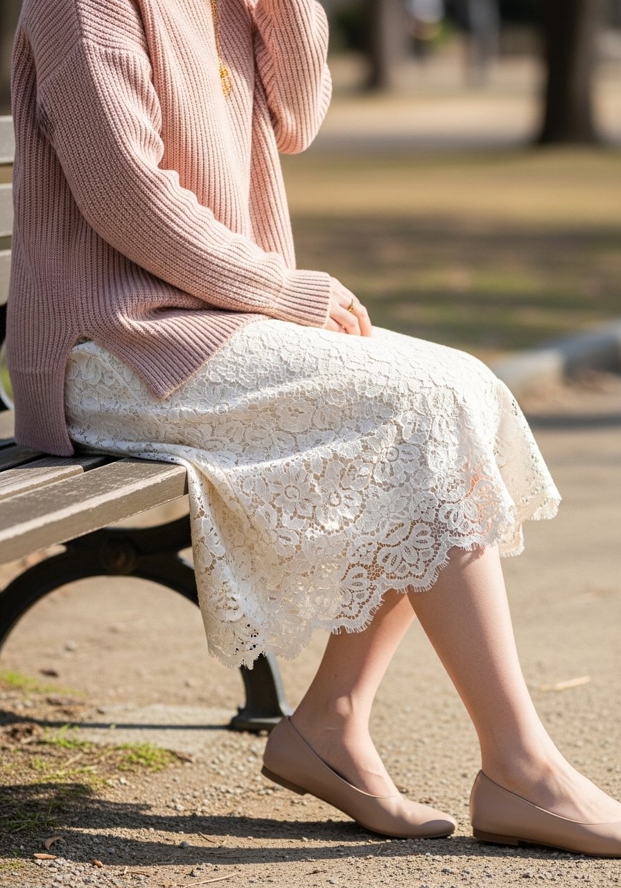 I wore this to run errands but still felt put together. The trick: match shades closely. It makes lace look modern, not frilly. I learned the hard way that a boxy tee ruins the silhouette—switch to a fitted tee.