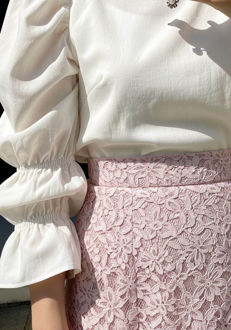 4. Soft Pastel Lace Skirt With Romantic Puff-Sleeve Blouse