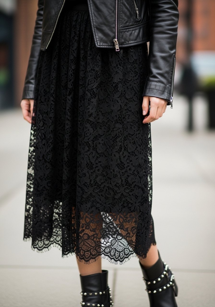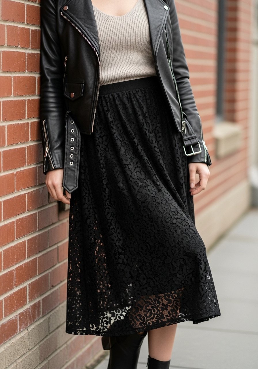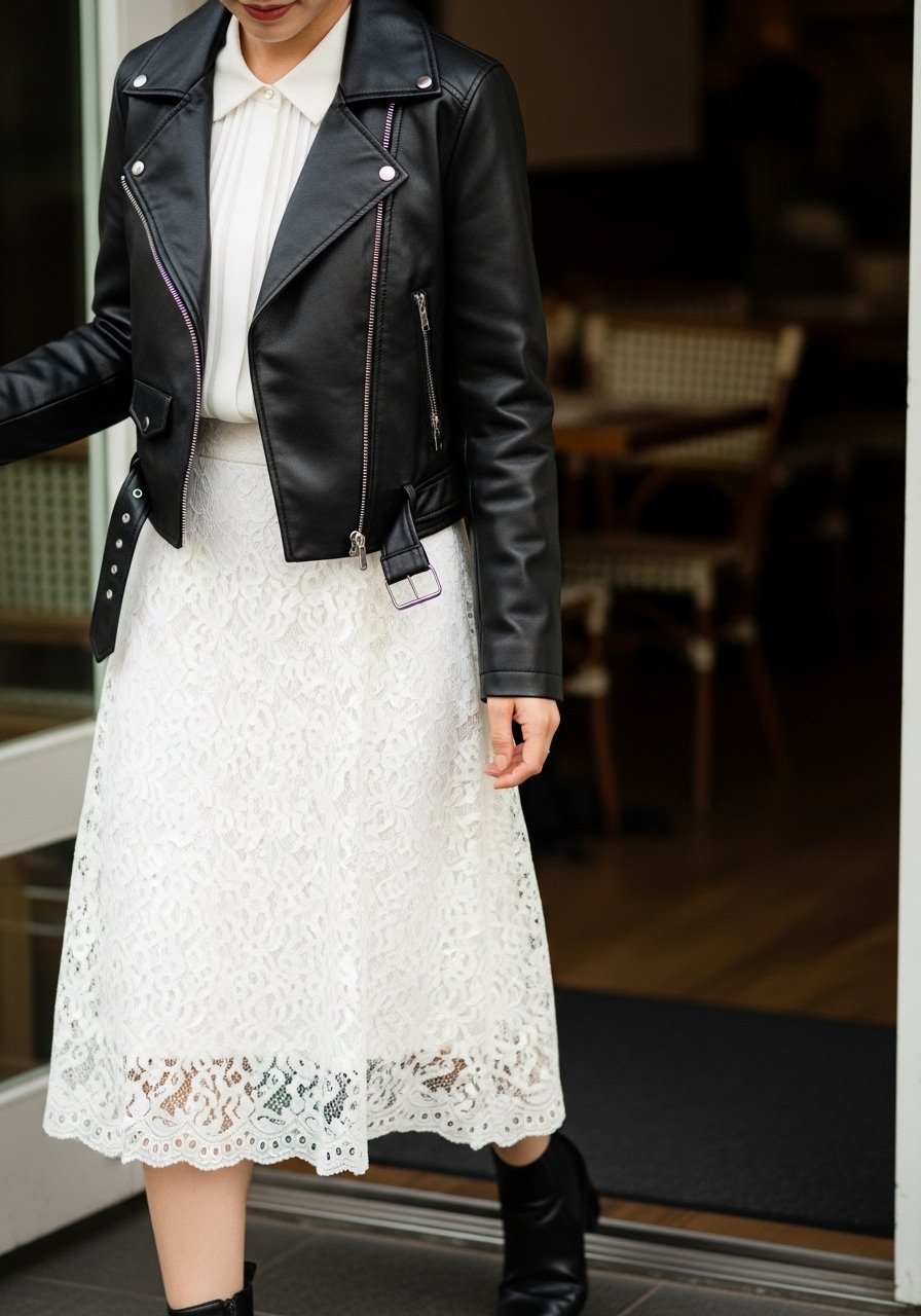 This combination surprised me. The leather jacket makes lace feel worn-in instead of fussy. I wore it to an evening out and got compliments. My first try paired too-heavy boots that clashed—choose sleek ankle boots instead.