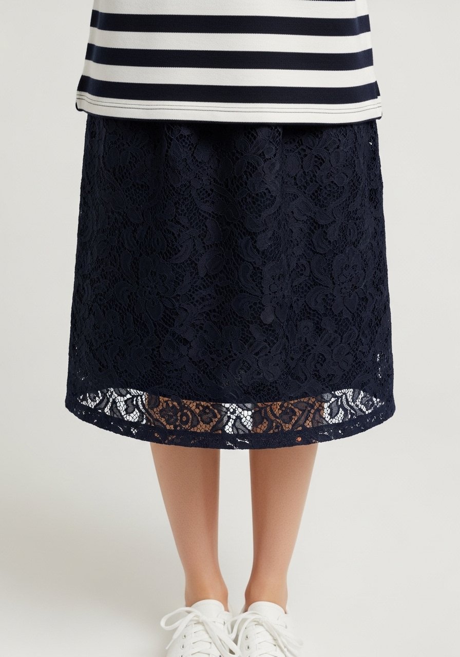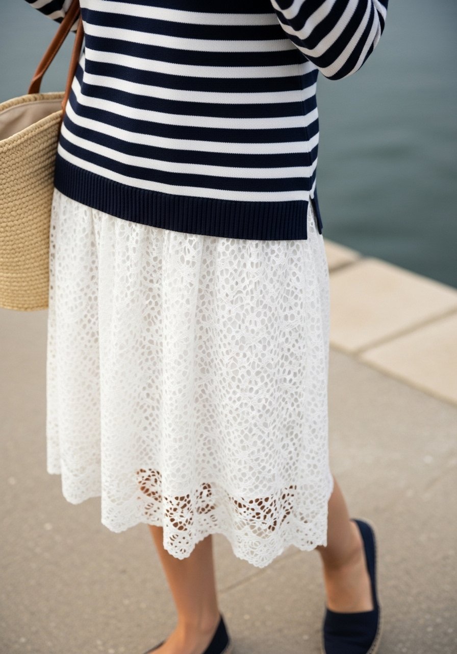 I wear stripes because they ground lace instantly. This is my favorite for casual Fridays. The tee keeps the outfit approachable. Early on I chose a thick knit that added bulk—pick a slim tee.