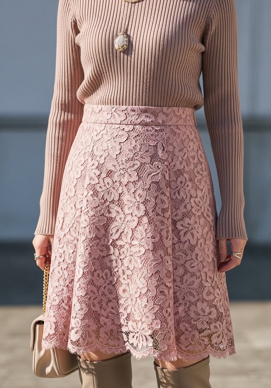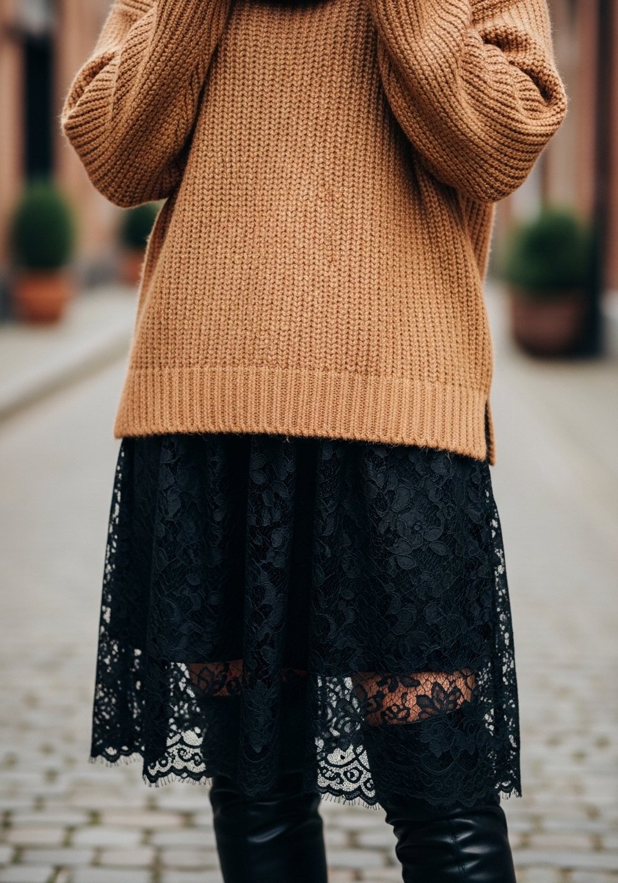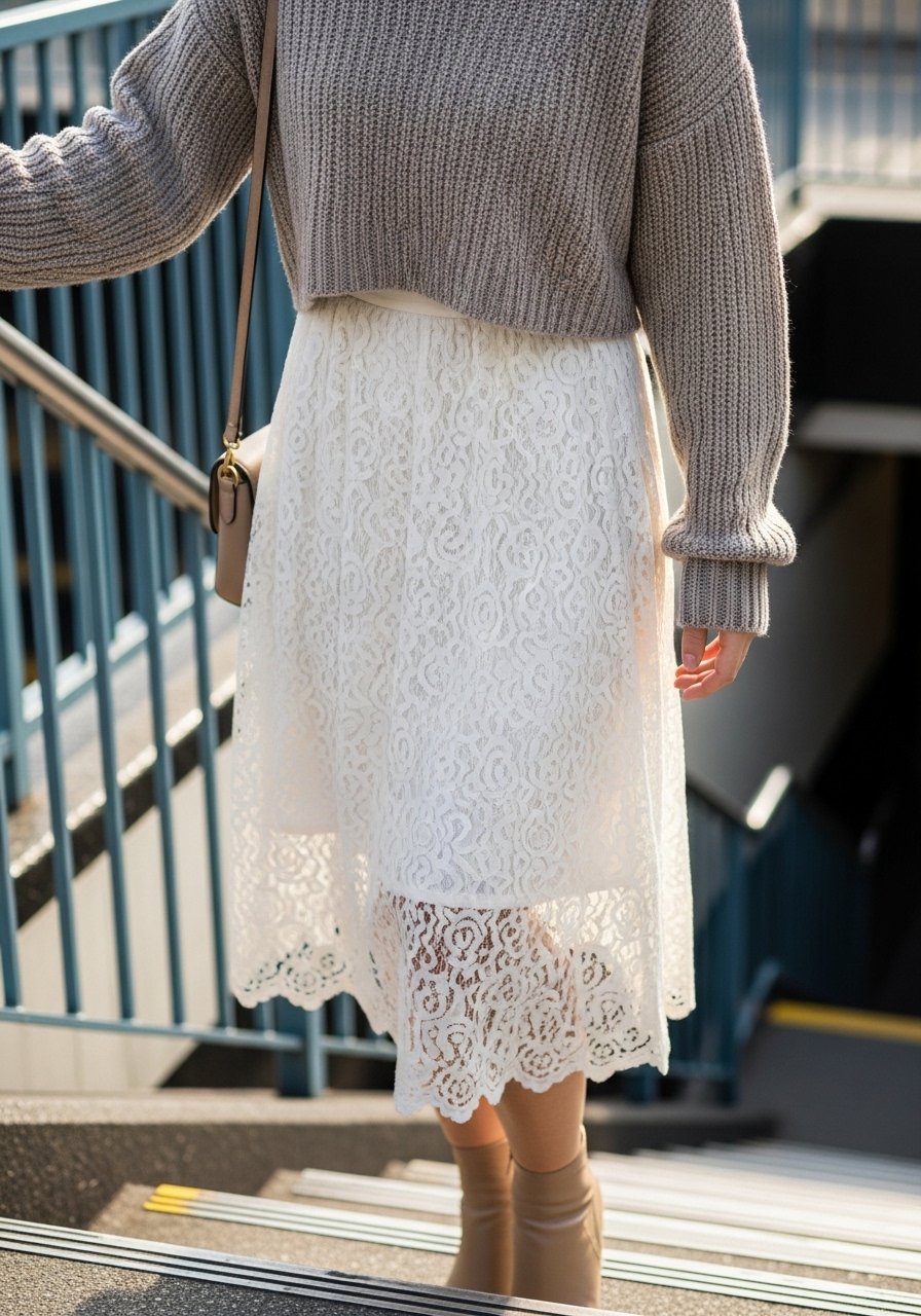 I wear a thin turtleneck under a lace skirt when temps dip. It’s warm without adding bulk. I once tried a chunky knit and it overwhelmed the skirt’s delicacy.