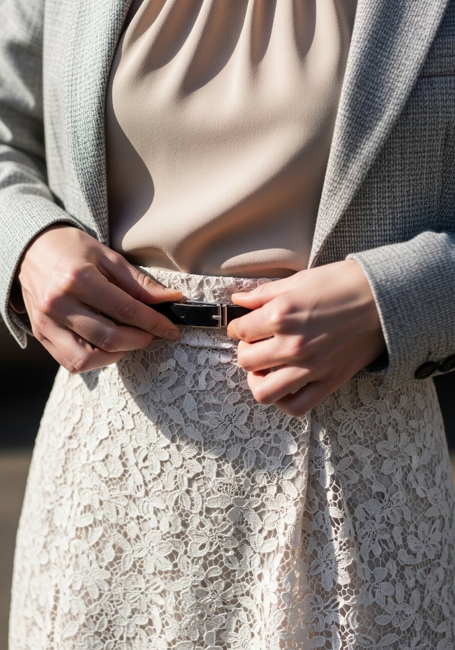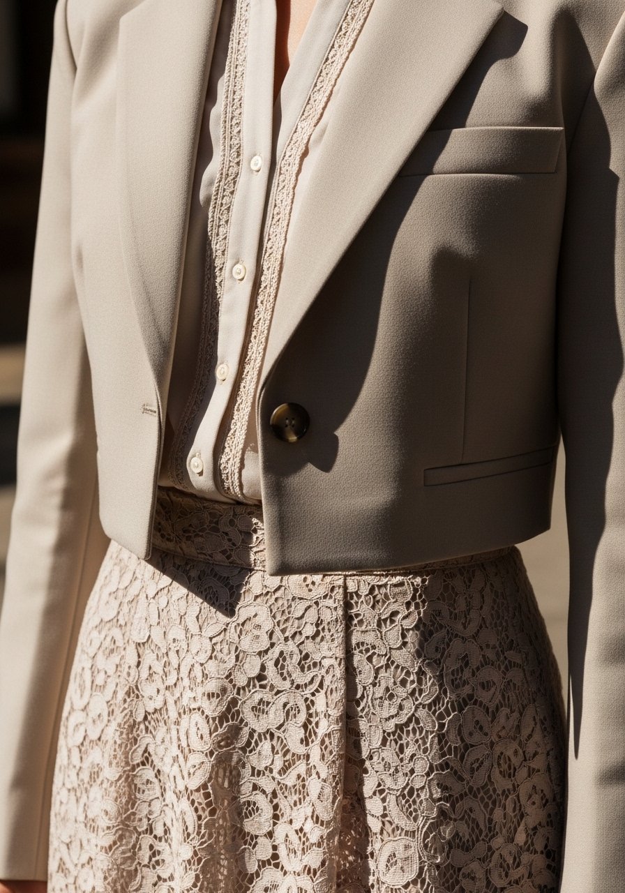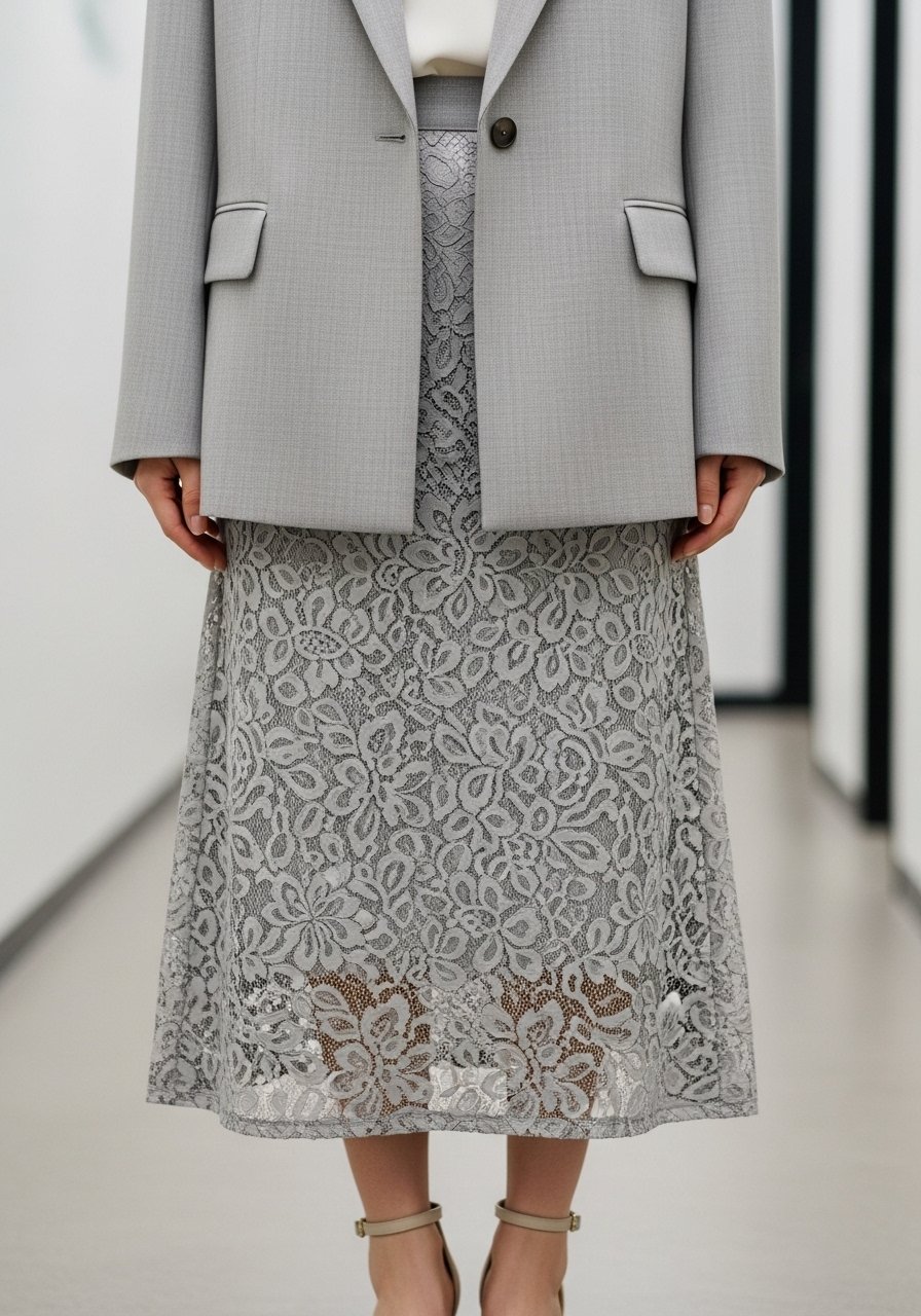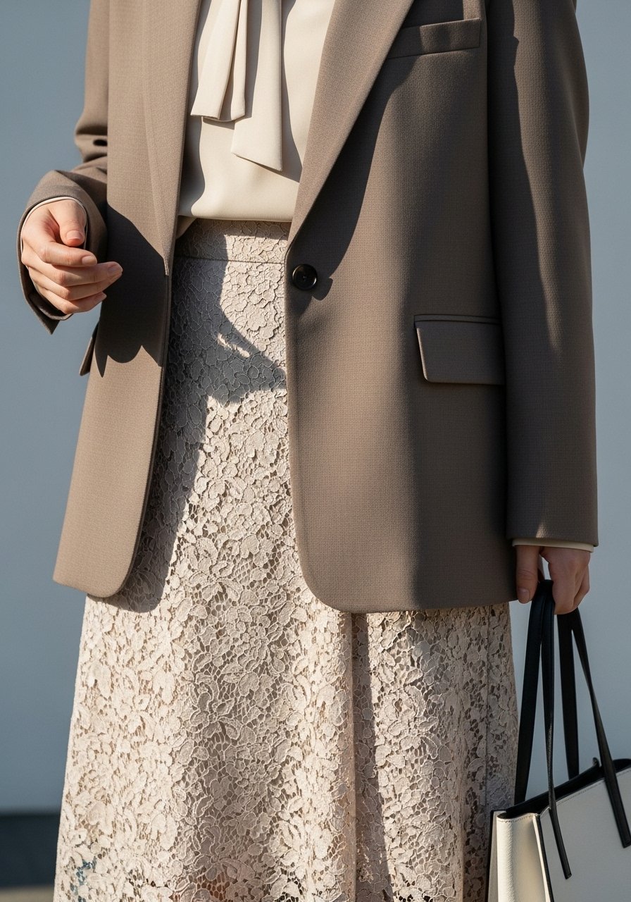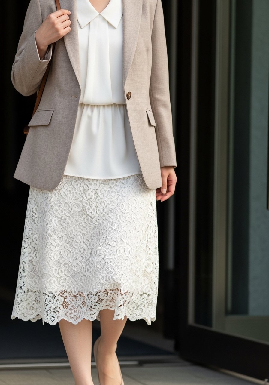 I tested lace in the office and felt on point with a boxy blazer. The blazer gives authority. I once picked a blazer that was too long and it hid the skirt shape—choose a shorter length.