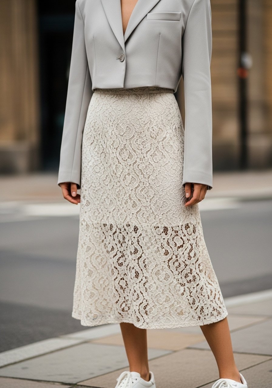 16. Lace Skirt With Cropped Blazer And Sneakers
