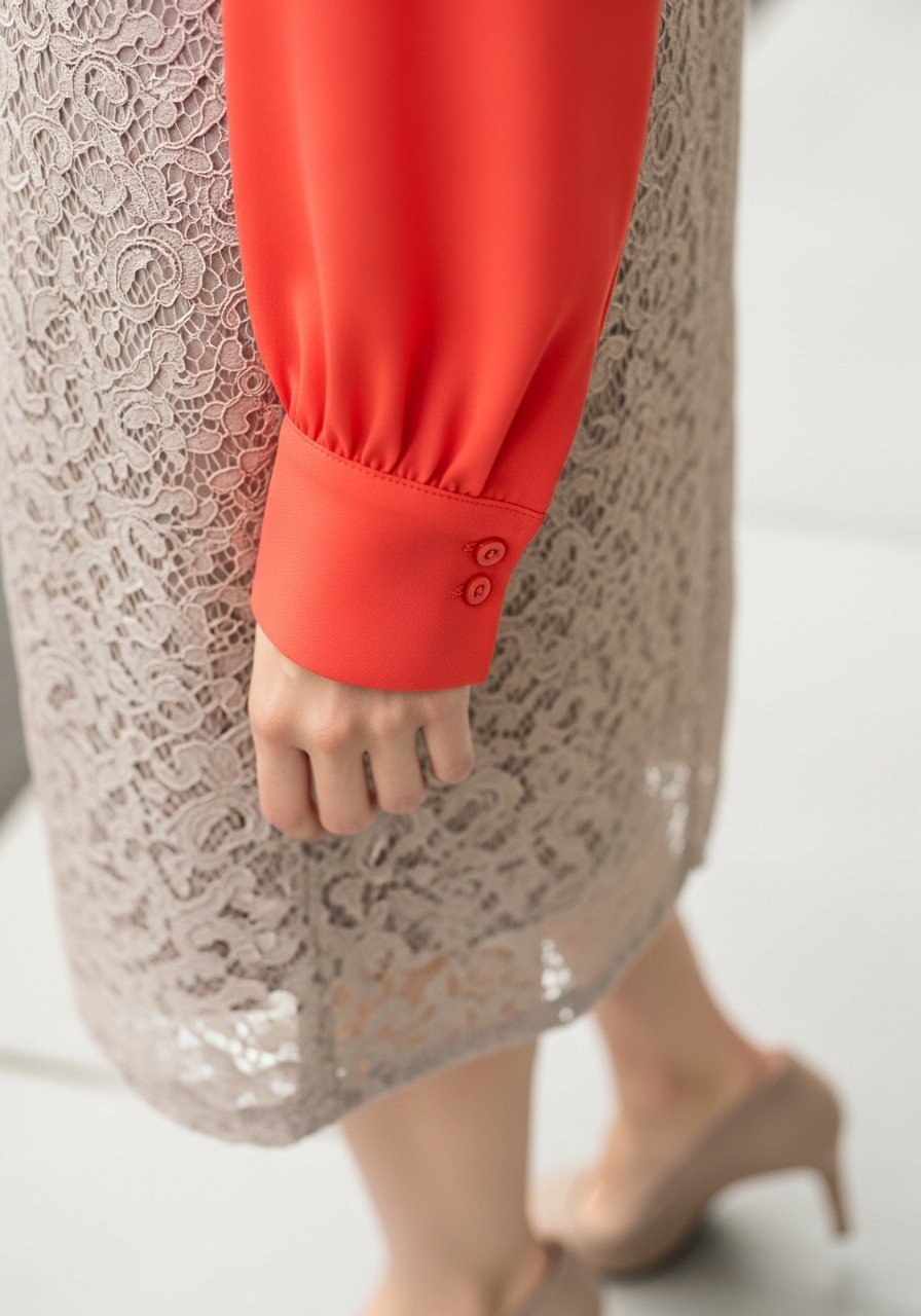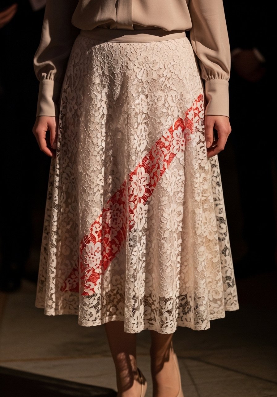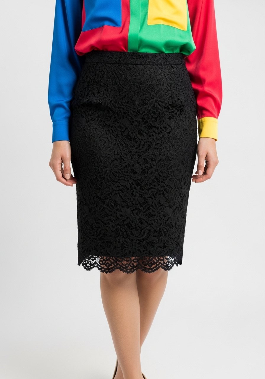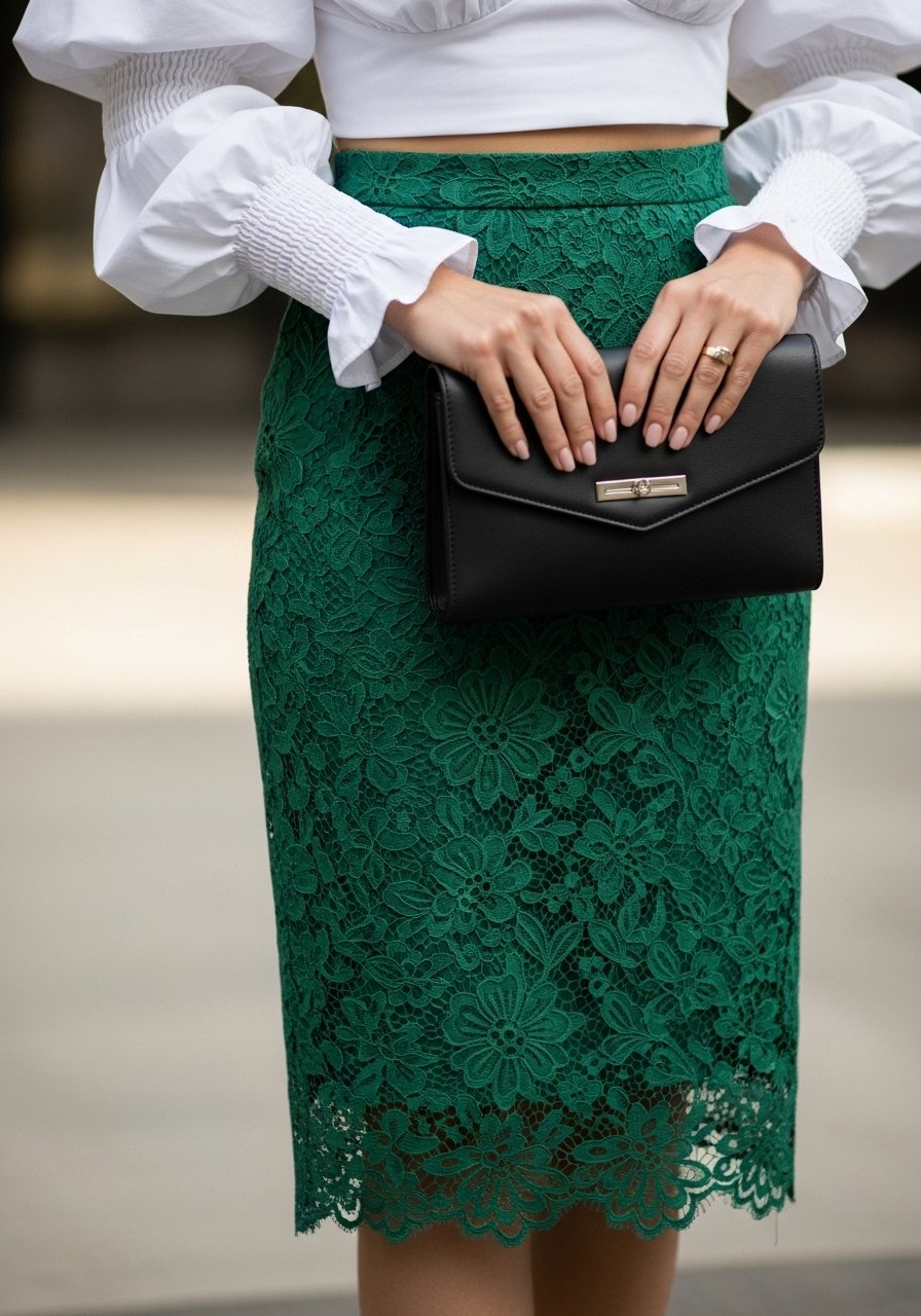 I used a bold color-block blouse to make lace less predictable. The tucked blouse keeps the outfit sharp. I once let the blouse hang untucked and it hid the skirt’s detail—tucking matters.