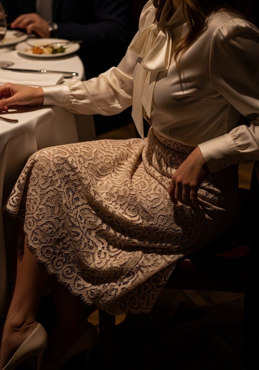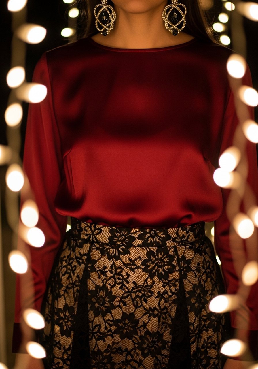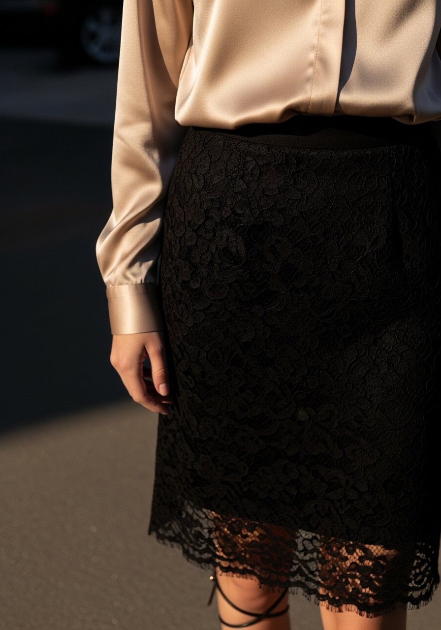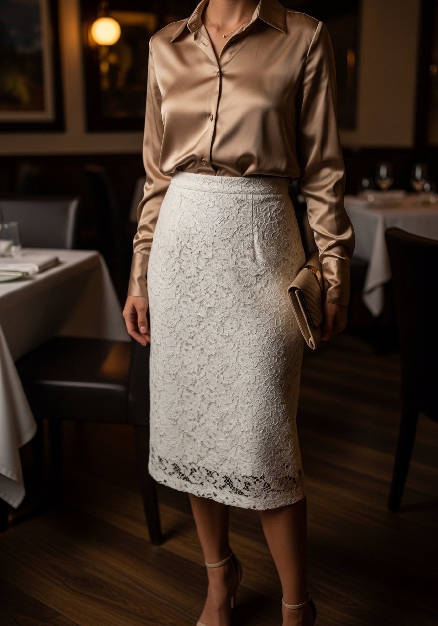 I wore this to a work event. Satin and lace read professional when colors are muted. I once chose a blouse with giant sleeves—avoid too much volume if your skirt is slim.