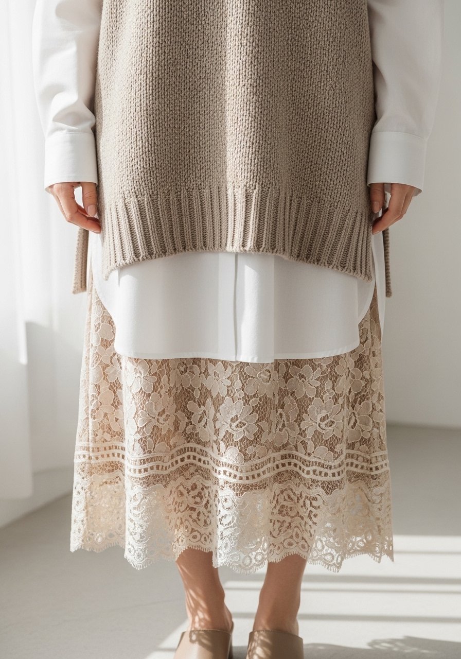 This felt like wearing a sweater to brunch but prettier. The knit softens lace and keeps it wearable in cool weather. I made the mistake of tucking the entire sweater once—it looked bulky.