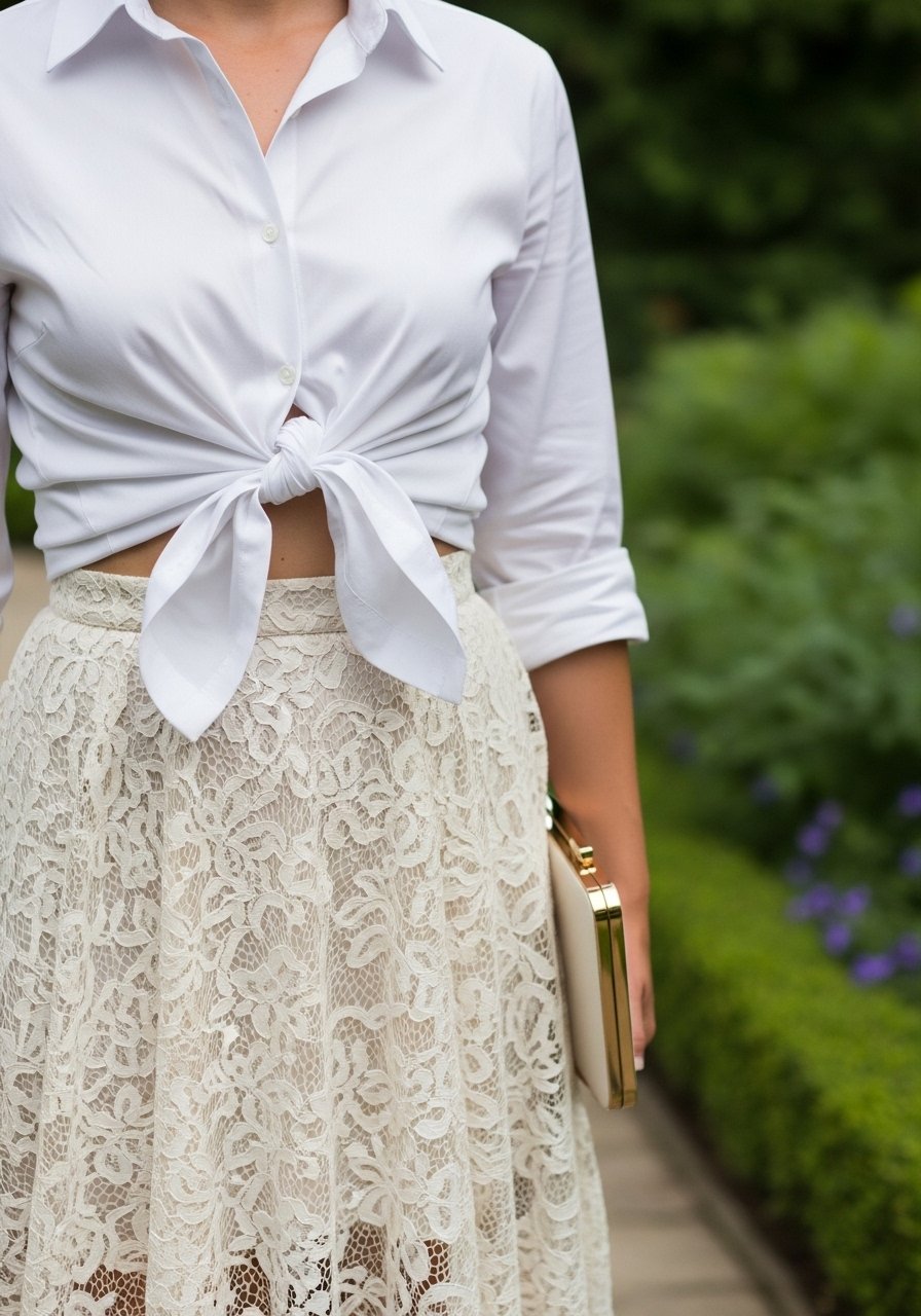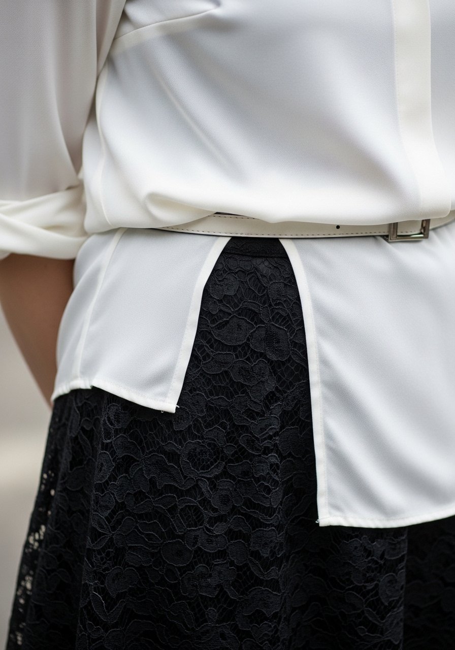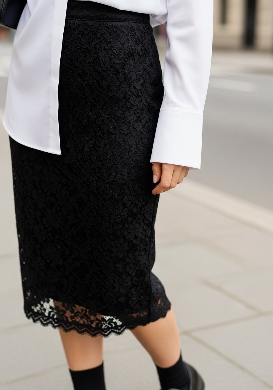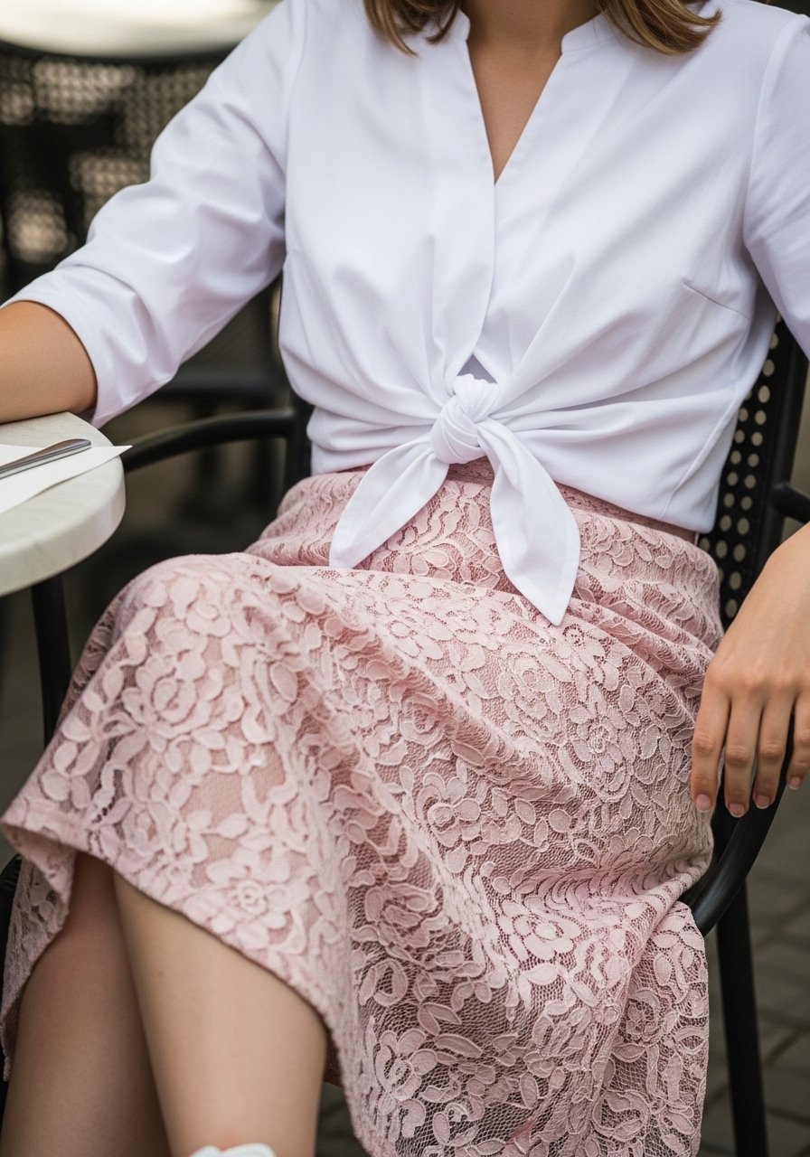 I wore this when I wanted safe elegance. The lace feels dressy, the white shirt keeps it simple. I noticed the outfit reads cleaner when the shirt is slightly oversized and cuffed.