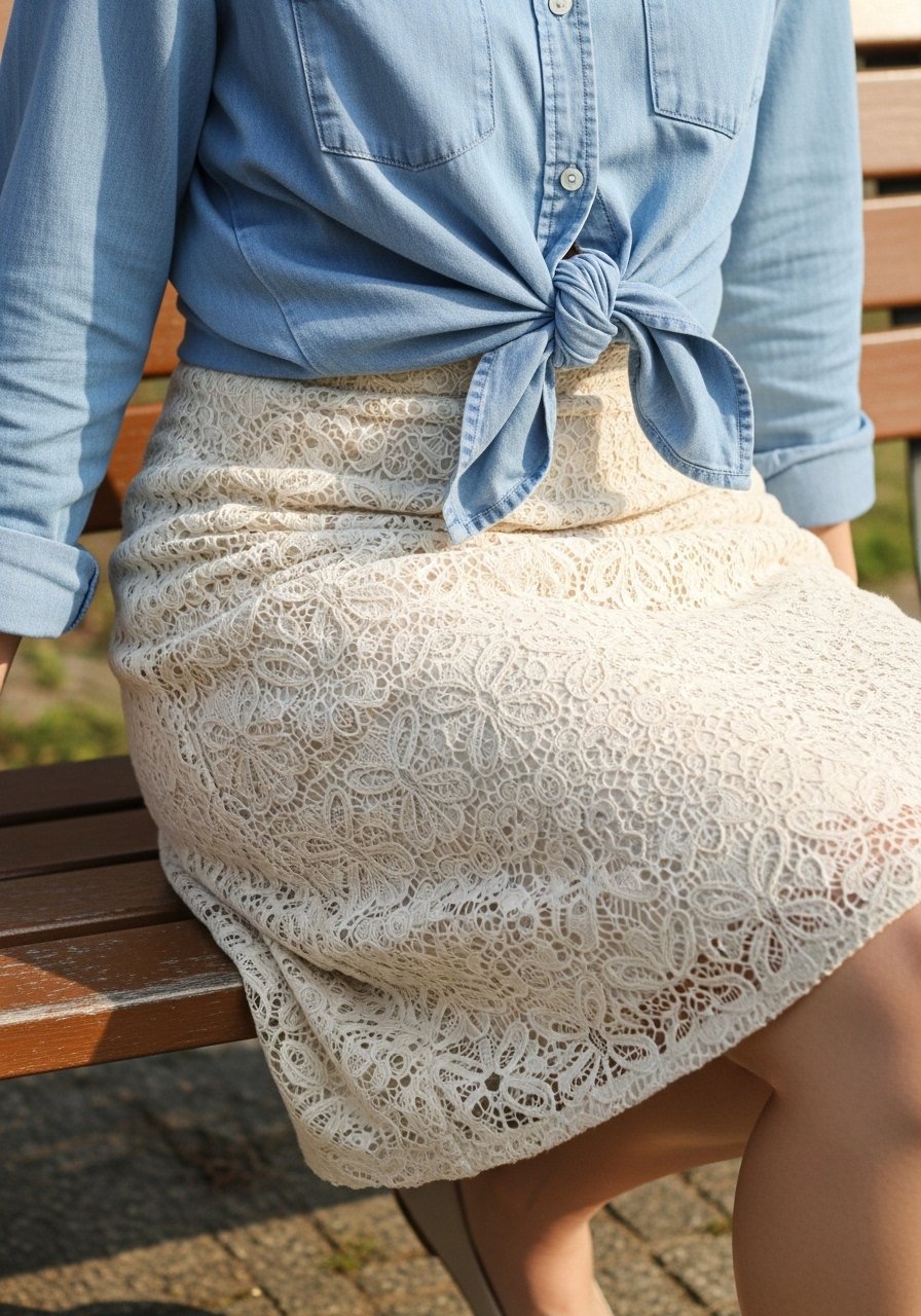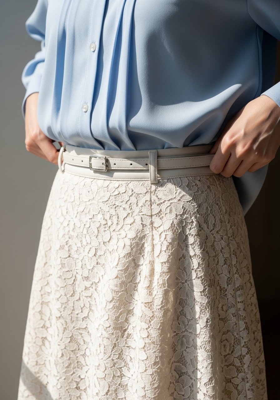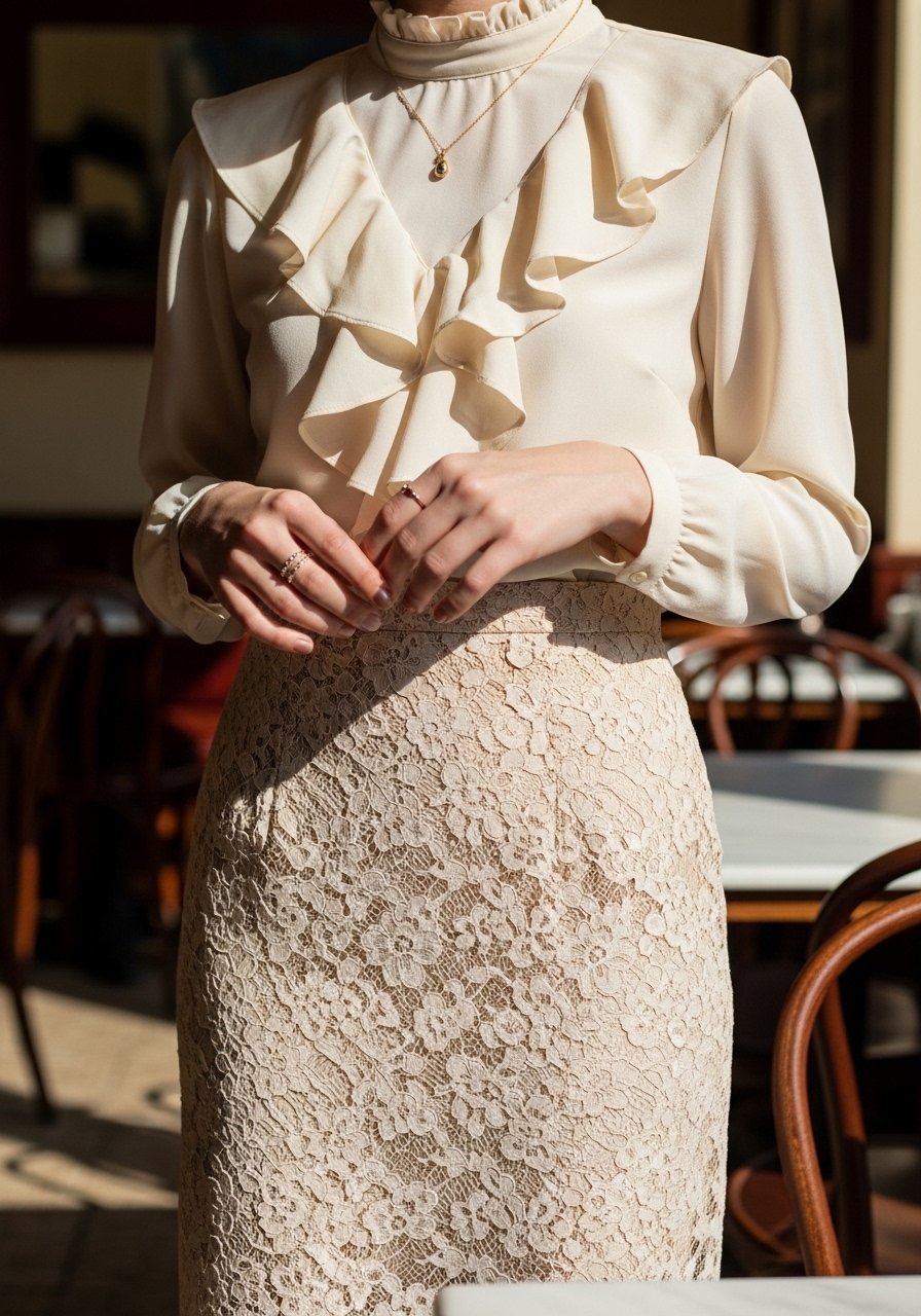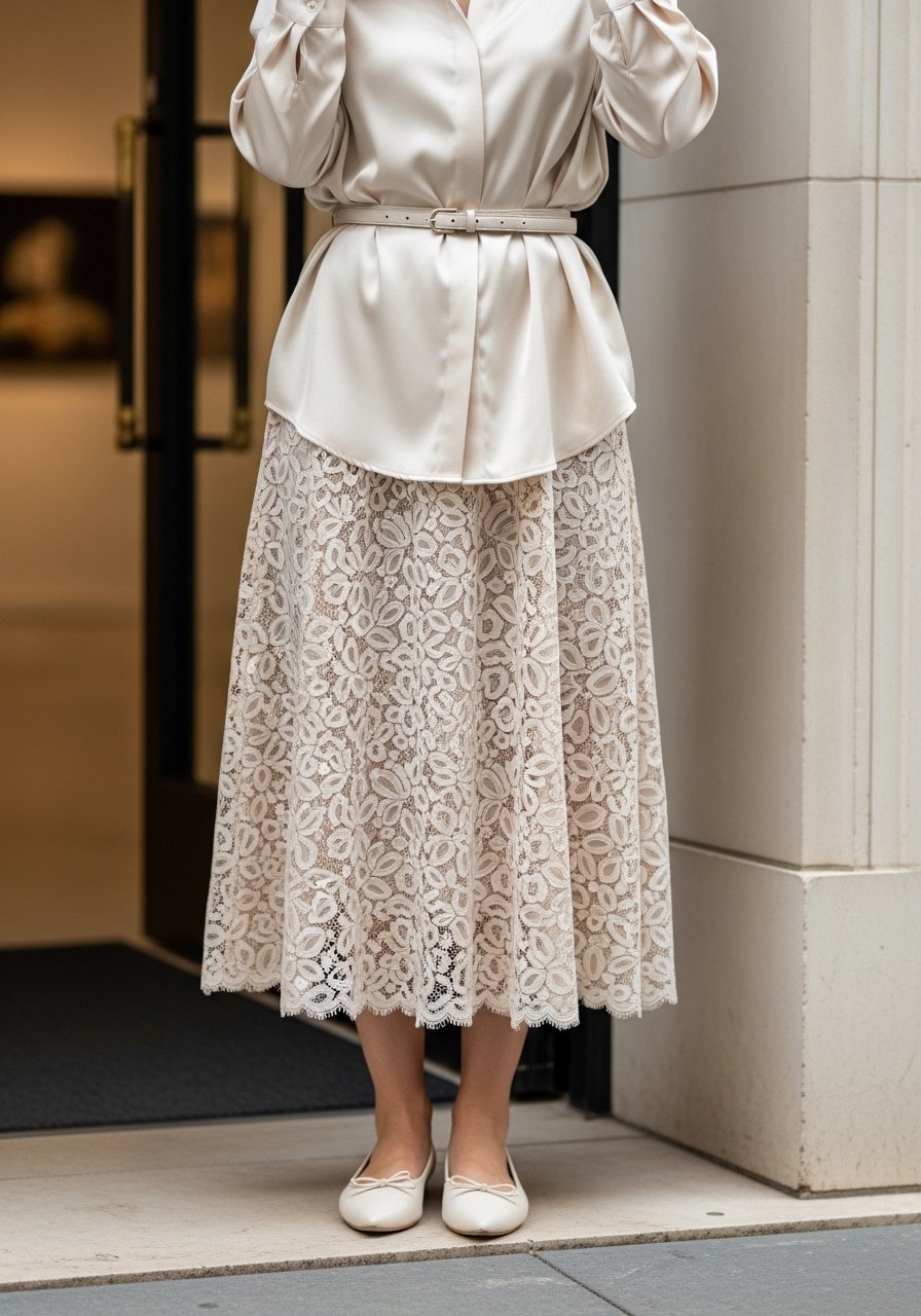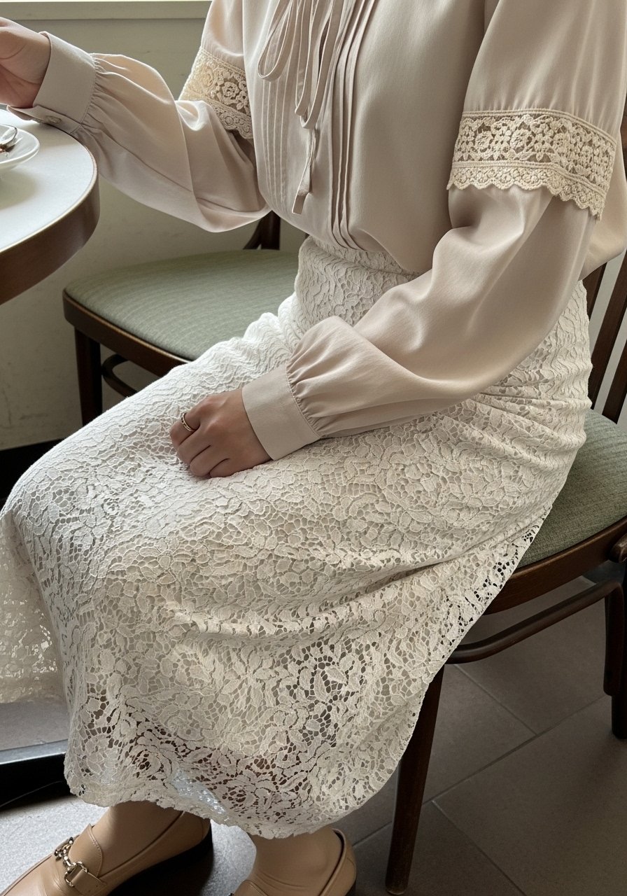 I wore this when I wanted safe elegance. The lace feels dressy, the white shirt keeps it simple. I noticed the outfit reads cleaner when the shirt is slightly oversized and cuffed.