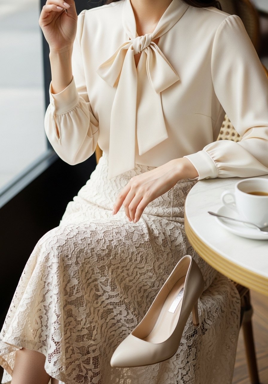 I reserve bow-neck blouses for dinners. The satin ties read luxe with lace. I once tied the bow too large and it distracted—make it neat and proportionate.