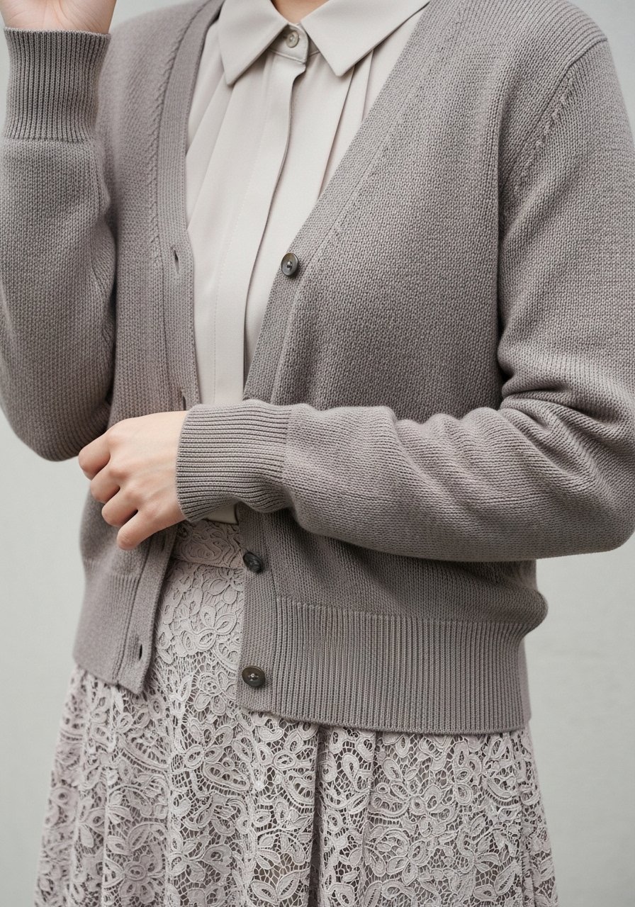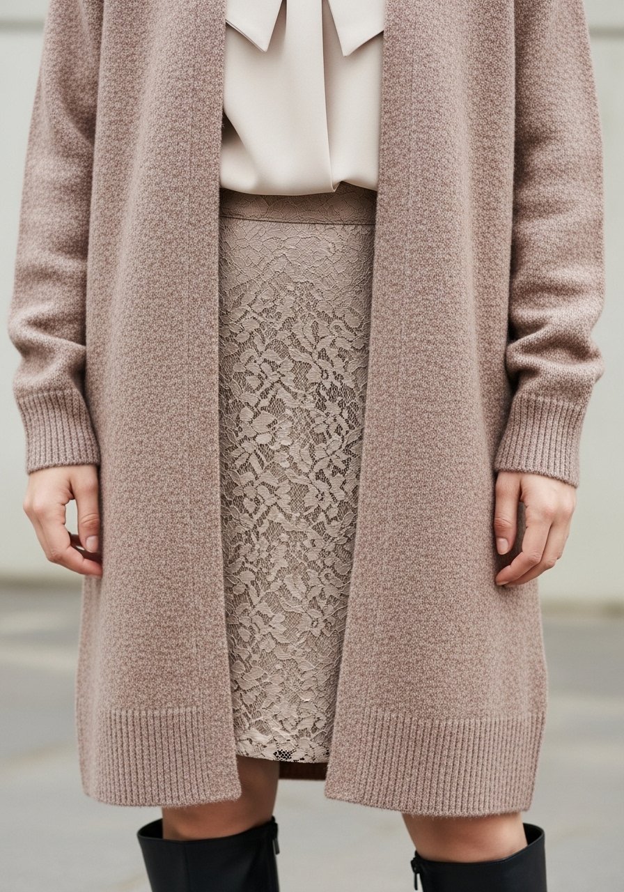 This feels like the coziest option. The cropped cardigan keeps proportions clear and makes lace feel soft. I once chose a cardigan that gaped—look for a cropped length that closes cleanly.