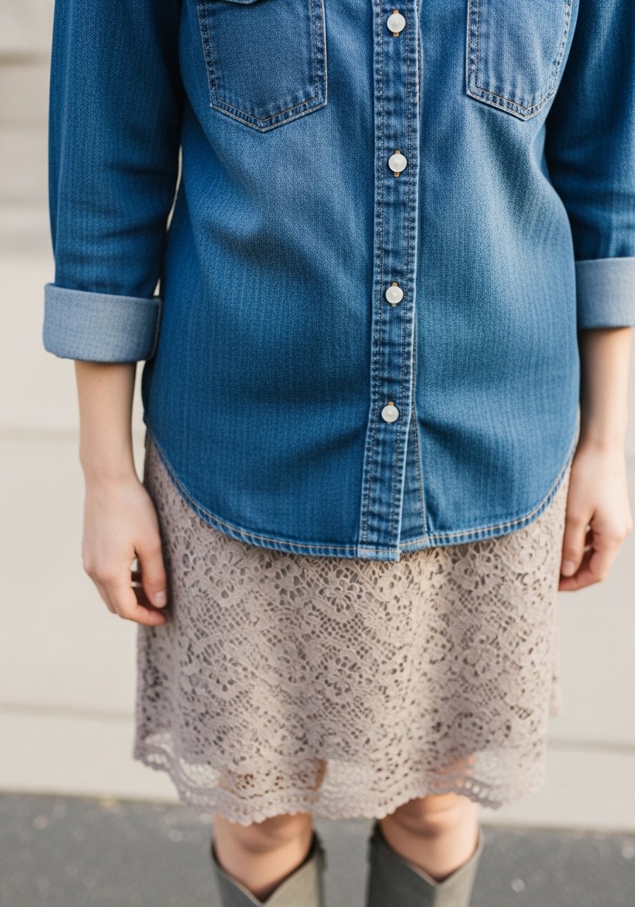 I tied a denim shirt at the waist to break up a lace maxi. It makes a softer, relaxed vibe. I made the mistake of a heavy shirt once; pick a lightweight chambray.