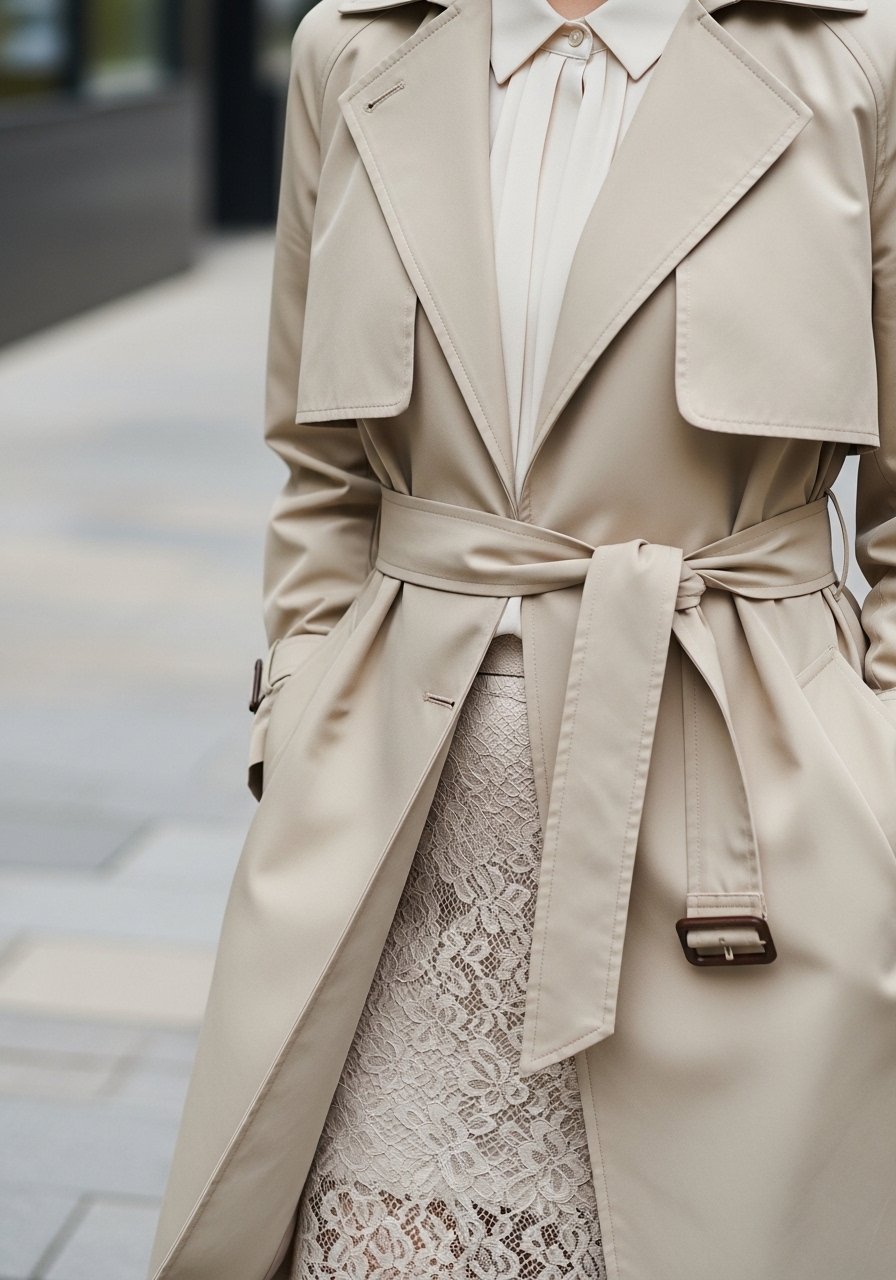 I throw a trench over lace when I want a classic vibe. The trench tones down lace’s bravado and makes it day-appropriate. I once chose a stiff trench that looked stiff—pick a fluid fabric.