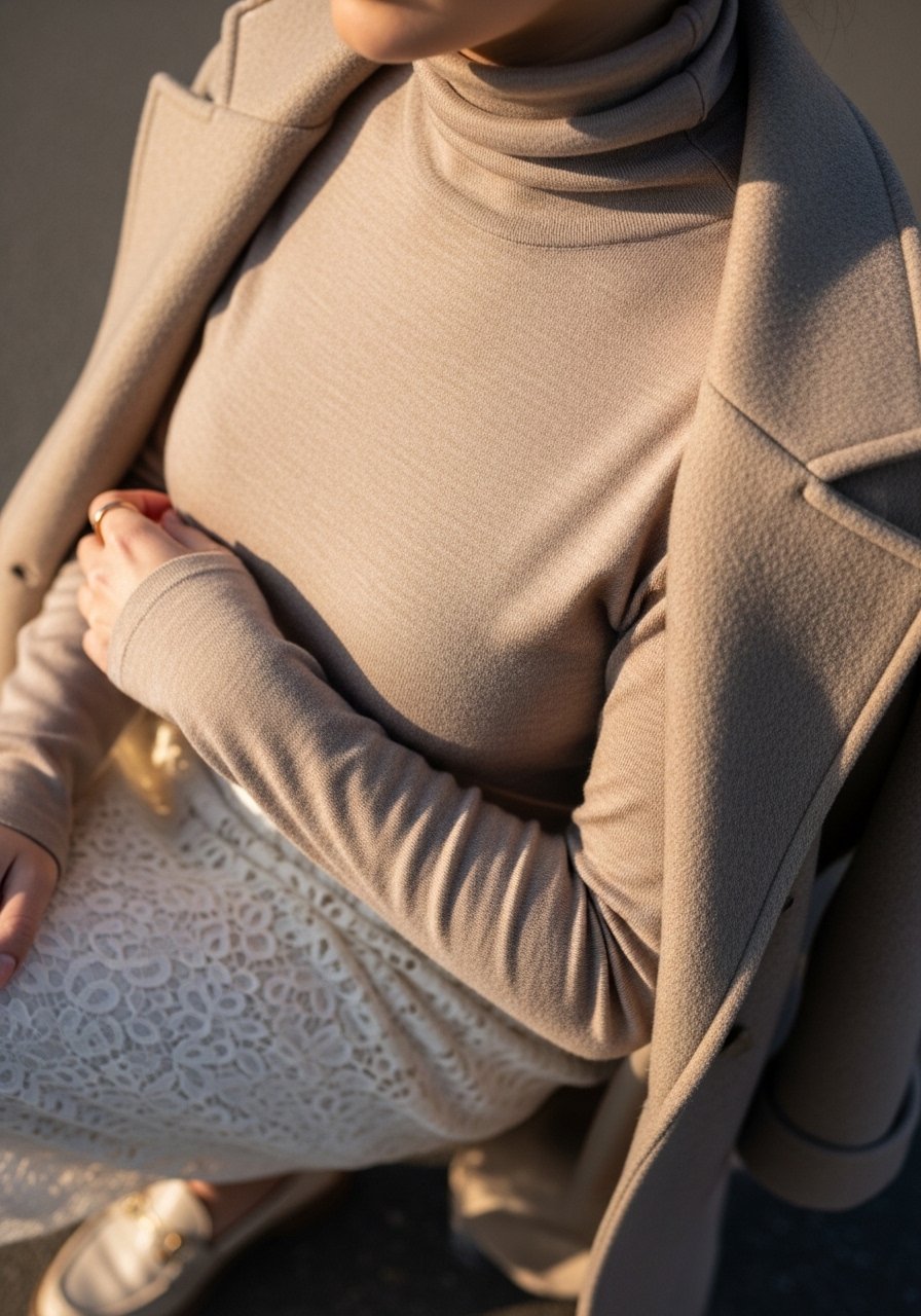 12. Neutral Turtleneck With Lace Skirt For Cooler Days