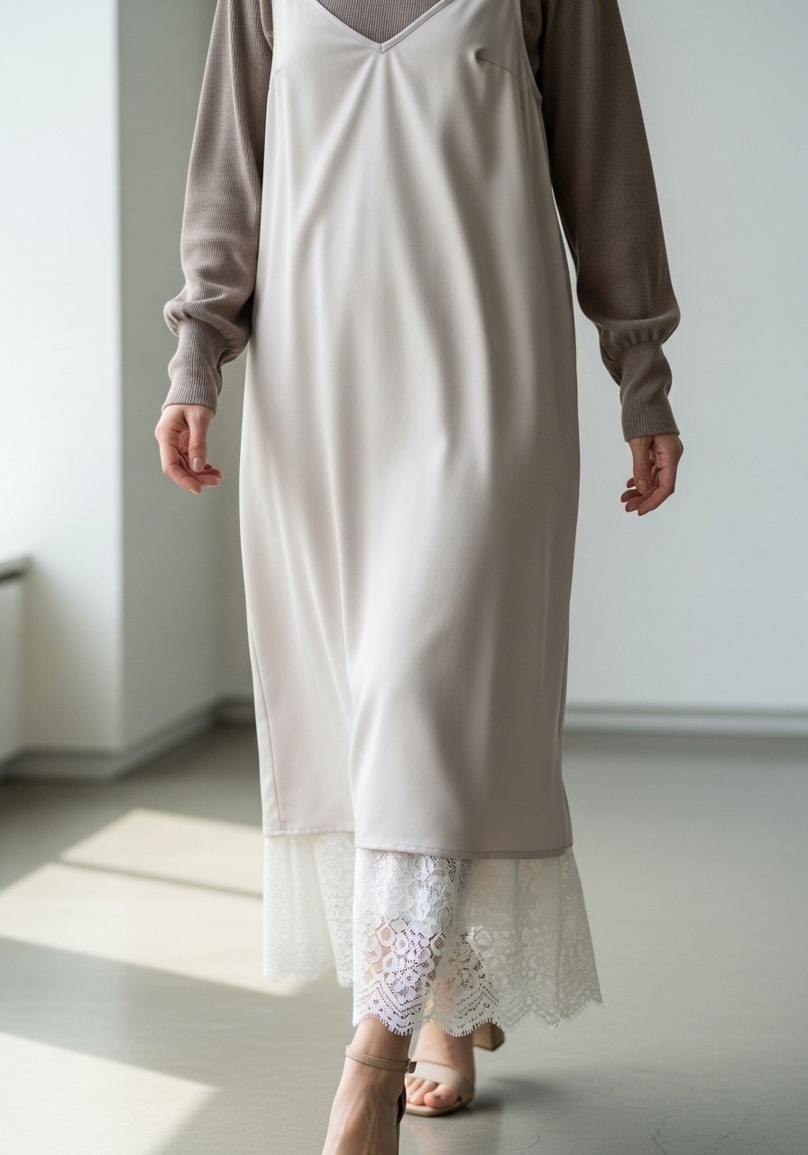 Keep the slip color close to skin or the top for cohesion. A thin strap sandal finishes the look.