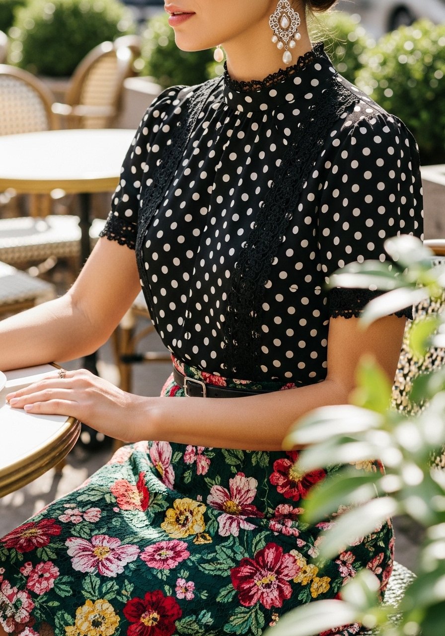 I picked a busy blouse to contrast lace. On me, the pattern keeps the look lively. I learned to tone down jewelry when prints are loud.